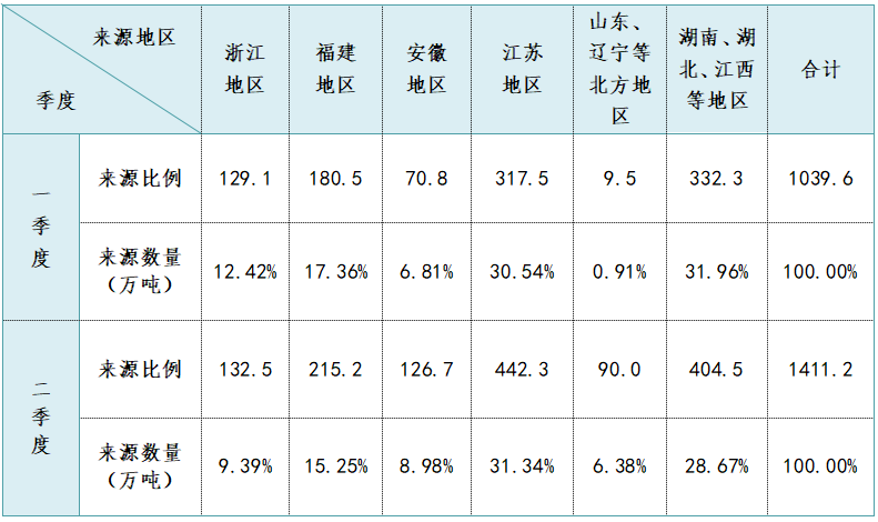 2024年上半年本市建設(shè)用砂主要來源于進滬運輸便捷的長江沿線地區(qū)和同樣具備內(nèi)河和海運條件的砂源交易聚集地江蘇。從二個季度的數(shù)據(jù)表來看,從砂源交易聚集地江蘇地區(qū),湖南、湖北、江西等沿江地區(qū)砂量較高,占比均約30%左右,福建、安徽、浙江地區(qū)占比居中,北方地區(qū)占最少。