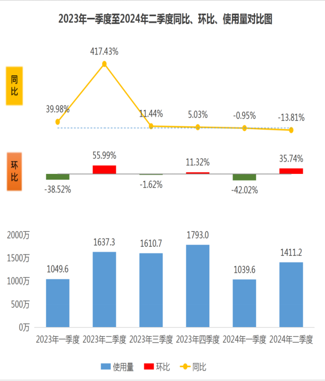 圖1:2023年一季度至2024年二季度同比、環(huán)比、使用量對比圖