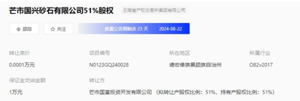 7月26日,據(jù)全國產(chǎn)權(quán)行業(yè)信息化綜合服務(wù)平臺披露,云南省德宏傣族景頗族自治州芒市國資委全資子公司——芒市國富投資開發(fā)有限公司掛牌轉(zhuǎn)讓旗下砂石公司51%股權(quán),轉(zhuǎn)讓底價0.0001萬元(即1元),信息披露起止時間為2024年7月26日至2024年8月22日。