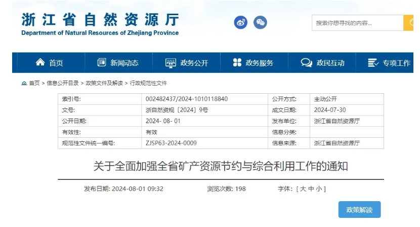 8月1日,浙江省自然資源廳發(fā)布《關于全面加強全省礦產資源節(jié)約與綜合利用工作的通知》。通知明確大力推廣先進采礦方法,新建、改擴建地下開采固體礦山原則上應采用充填法開采,不能采用的應嚴格論證。推廣尾礦制備新型建筑材料、尾礦充填等先進適用技術,推進無尾礦山建設。該通知自2024年9月1日起施行。