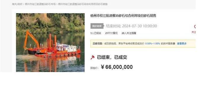 近日,在京東拍賣上,梧州市迎來了一宗重量級拍賣,此次拍賣不屬于法拍,而是一宗正常的商業(yè)拍賣,拍賣的標(biāo)的物為梧州市桂江航道整治砂石綜合利用項目砂石銷售。起拍價6600萬元,最終只有一個人報名競拍,以起拍價拿下了梧州市桂江航道整治砂石綜合利用項目砂石銷售。