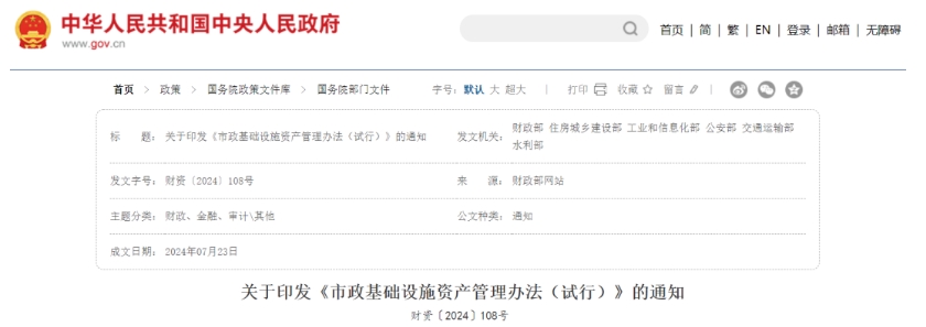 近日,財(cái)政部、住房城鄉(xiāng)建設(shè)部、工業(yè)和信息化部、公安部、交通運(yùn)輸部、水利部等六部門聯(lián)合印發(fā)《市政基礎(chǔ)設(shè)施資產(chǎn)管理辦法(試行)》,辦法自2024年9月1日起施行。
