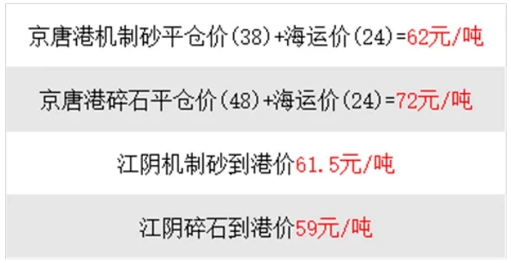 據(jù)砂石骨料網(wǎng)最新調(diào)研,2024年9月3日,京唐港區(qū)機(jī)制砂及碎石平倉價(jià)分別為38元/噸、48元/噸左右,而當(dāng)日京唐港區(qū)到達(dá)江陰地區(qū)2.7-3.5萬噸級船運(yùn)價(jià)為24元/噸,如此換算,當(dāng)?shù)?a href='http://m.chaolianshiji.com/news/' target='_blank'>砂石料到達(dá)江陰市場價(jià)格將達(dá)到62-72元/噸。然而,目前江陰市場機(jī)制砂、碎石到港價(jià)格分別為59元/噸、61.5元/噸左右。由此來看,京唐港地區(qū)砂石料到港已遠(yuǎn)超當(dāng)?shù)厥袌銎骄鶅r(jià)格。