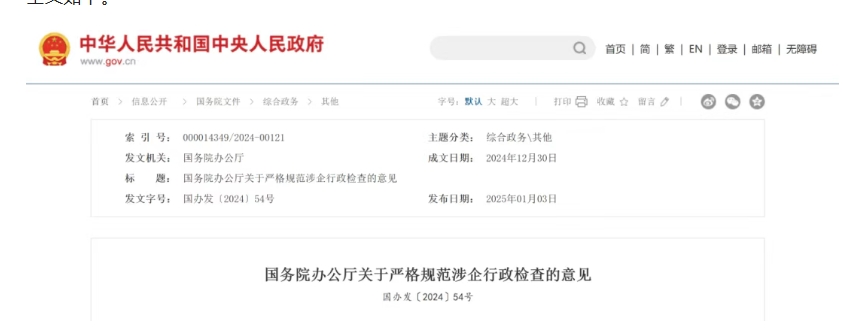 國務院辦公廳日前印發(fā)《關于嚴格規(guī)范涉企行政檢查的意見》,旨在貫徹落實黨中央關于進一步規(guī)范涉企執(zhí)法的決策部署,嚴格規(guī)范涉企行政檢查,堅決遏制亂檢查,切實減輕企業(yè)負擔。 意見明確,除行政執(zhí)法機關、法律法規(guī)授權組織、受委托組織外,任何組織和個人不得實施行政檢查。規(guī)范行政檢查行為,防止逐利檢查、任性檢查,涉企行政檢查要做到“五個嚴禁”“八個不得”。 嚴禁逐利檢查,不得接受被檢查企業(yè)的任何饋贈、報酬、福利待遇,不得參加被檢查企業(yè)提供的宴請、娛樂、旅游等活動,不得由被檢查企業(yè)支付消費開支或者將檢查費用轉嫁給企業(yè),不得強制企業(yè)接受指定的中介機構提供服務。嚴禁干擾企業(yè)正常生產經營,不得刻意要求法定代表人到場。嚴禁任性處罰企業(yè),不得亂查封、亂扣押、亂凍結、動輒責令停產停業(yè)。嚴禁下達檢查指標,不得將考核考評、預算項目績效與檢查頻次、罰款數(shù)額掛鉤。嚴禁變相檢查,不得以觀摩、督導、考察等名義行檢查之實。 全文如下。 國務院辦公廳關于嚴格規(guī)范涉企行政檢查的意見 國辦發(fā)〔2024〕54號 各省、自治區(qū)、直轄市人民政府,國務院各部委、各直屬機構:行政檢查是行政執(zhí)法主體履行行政管理職責的重要方式,對引導規(guī)范企業(yè)合法經營、預防糾正違法行為具有重要作用。為貫徹落實黨中央關于進一步規(guī)范涉企執(zhí)法的決策部署,嚴格規(guī)范涉企行政檢查,堅決遏制亂檢查,切實減輕企業(yè)負擔,經國務院同意,現(xiàn)提出以下意見。 一、總體要求 堅持以習近平新時代中國特色社會主義思想為指導,深入學習貫徹習近平法治思想,全面貫徹黨的二十大和二十屆二中、三中全會精神,針對行政檢查事項多、頻次高、隨意性大,以及任性檢查、運動式檢查、以各種名義變相檢查等突出問題,加強依法行政,確保行政檢查于法有據、嚴格規(guī)范、公正文明、精準高效,進一步優(yōu)化營商環(huán)境。 二、明確行政檢查主體,嚴禁不具備主體資格的組織實施行政檢查 實施行政檢查的主體必須具備法定資格。具有行政執(zhí)法權的行政機關必須在法定職責范圍內實施行政檢查;法律、法規(guī)授權的具有管理公共事務職能的組織必須在法定授權范圍內實施行政檢查;受委托組織必須在委托范圍內實施行政檢查。除上述主體外,任何組織和個人不得實施行政檢查。行政檢查主體資格要依法確認并向社會公告。嚴禁政府議事協(xié)調機構以各種名義實施行政檢查;嚴禁檢驗檢測機構、科研院所等第三方實施行政檢查;嚴禁外包給中介機構實施行政檢查;嚴禁未取得執(zhí)法證件的執(zhí)法輔助人員、網格員、臨時工等人員實施行政檢查。 三、清理并公布行政檢查事項,從源頭上遏制亂檢查 有關主管部門要嚴格落實權責清單制度,梳理本領域現(xiàn)有的涉企行政檢查事項并實行動態(tài)管理,對沒有法定依據的要堅決清理,對法定依據發(fā)生變化的要及時調整,對沒有實際成效的要予以取消。行政檢查事項要按照權責透明、用權公開的要求向社會公布,接受企業(yè)和社會監(jiān)督。行政檢查事項未經公布的,不得實施。 四、合理確定行政檢查方式,最大限度減少入企檢查頻次 大力推進精準檢查,防止重復檢查、多頭檢查。能合并實施行政檢查的,不得重復檢查;能聯(lián)合實施行政檢查的,不得多頭檢查;能通過書面核查、信息共享、智慧監(jiān)管等方式監(jiān)管的,不得入企實施現(xiàn)場檢查。嚴控入企檢查人員數(shù)量,優(yōu)化“綜合查一次”、“雙隨機、一公開”抽查,推行簡單事項“一表通查”。除有法定依據外,不得將入企檢查作為行政許可、行政給付等行政行為的前提條件。2025年6月底前,國務院有關主管部門要建立本領域分級分類檢查制度;有關主管部門要公布同一行政機關對同一企業(yè)實施行政檢查的年度頻次上限。行政檢查頻次要納入行政執(zhí)法統(tǒng)計年報。根據投訴舉報、轉辦交辦、數(shù)據監(jiān)測等線索確需實施行政檢查,或者應企業(yè)申請實施行政檢查的,可以不受頻次上限限制,但明顯超過合理頻次的,行政執(zhí)法監(jiān)督機關要及時跟蹤監(jiān)督。探索建立涉企行政執(zhí)法案件經濟影響評估制度,依法降低行政執(zhí)法特別是行政檢查對企業(yè)的負面影響。 五、嚴格行政檢查標準、程序,杜絕隨意檢查 國務院有關主管部門要梳理本領域現(xiàn)有的行政檢查標準并于2025年6月底前公布。不同領域行政檢查標準相互沖突的,有關主管部門要按照規(guī)定提請本級政府或者上一級行政機關進行協(xié)調,避免企業(yè)無所適從。實施行政檢查前,要制定檢查方案并報行政執(zhí)法主體負責人批準,不得僅由內設機構負責人批準。情況緊急、需要當場實施的,要及時報告并補辦手續(xù)。實施行政檢查時,要出具行政檢查通知書。加快推行“掃碼入企”,將行政檢查主體、人員、內容、結果等數(shù)據實時上傳至信息系統(tǒng)。執(zhí)法人員要主動出示執(zhí)法證件,嚴禁以其他證件代替執(zhí)法證件實施行政檢查;人民警察要出示人民警察證件。除法律另有規(guī)定外,執(zhí)法人員不得少于兩人。入企檢查要制作現(xiàn)場檢查筆錄,必要時