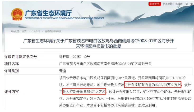 據(jù)從廣東省生態(tài)環(huán)境廳獲悉,廣東省茂名市電白區(qū)放雞島西南側(cè)海域CS008-01礦區(qū)海砂開采環(huán)境影響報告書(以下簡稱《報告書》)獲批復(fù)。據(jù)了解,該項(xiàng)目設(shè)計(jì)最大資源可開采原礦礦石量為2322.31萬方,設(shè)計(jì)年最大控制開采量854萬方,預(yù)計(jì)開采年限2.72年,采用4艘采砂能力為900立方米/小時的射流抽吸式采砂船進(jìn)行作業(yè)。