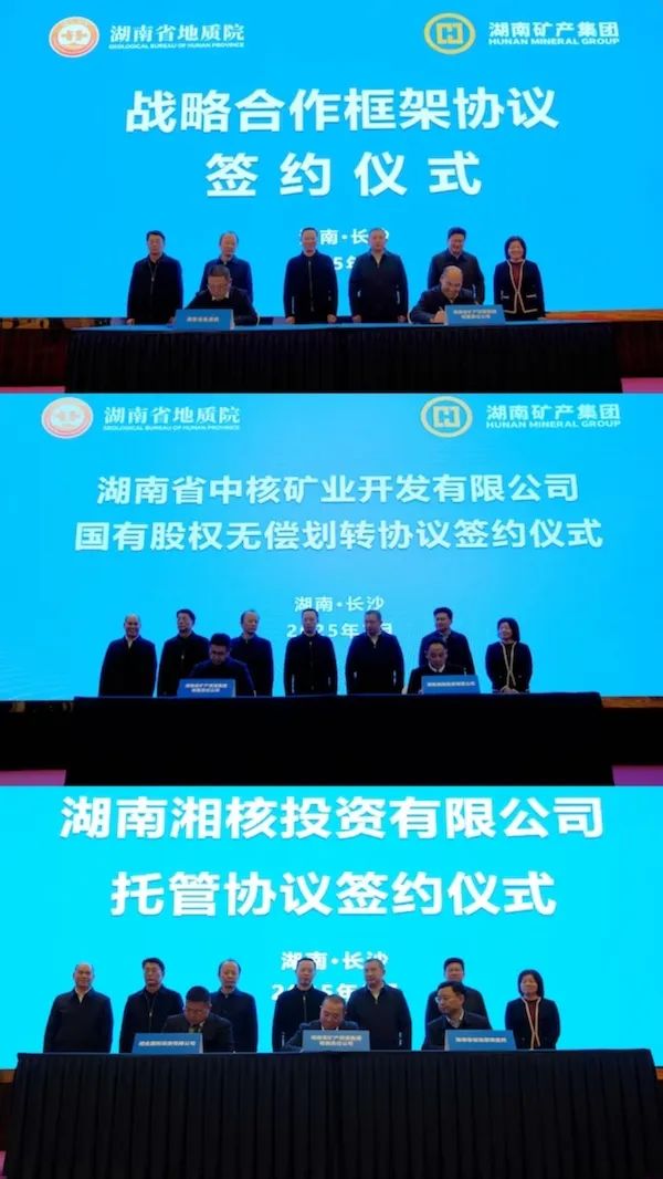 儀式上,雙方簽署《戰(zhàn)略合作框架協(xié)議》《中核礦業(yè)國(guó)有股權(quán)無(wú)償劃轉(zhuǎn)協(xié)議》《湘核投資托管協(xié)議》三項(xiàng)核心文件。通過(guò)協(xié)議,雙方將整合資源與產(chǎn)業(yè)優(yōu)勢(shì),聚焦礦產(chǎn)資源勘查開(kāi)發(fā)、綜合利用、綠色礦山建設(shè)等領(lǐng)域深化合作,共同構(gòu)建“探、采、供、銷(xiāo)”一體化產(chǎn)業(yè)鏈。此舉是貫徹落實(shí)省委、省政府關(guān)于打造萬(wàn)億級(jí)礦業(yè)產(chǎn)業(yè)集群戰(zhàn)略部署,加速推進(jìn)礦業(yè)產(chǎn)業(yè)轉(zhuǎn)型升級(jí)的務(wù)實(shí)舉措,也是深化地勘單位改革、推動(dòng)事企分離的里程碑式實(shí)踐。 據(jù)了解,自2014年湖南省委對(duì)省地勘單位啟動(dòng)新一輪體制改革以來(lái),湖南省地質(zhì)院歷經(jīng)2019年原四局整合重組、2021年15家院屬事業(yè)單位掛牌、2024年成立礦產(chǎn)資源集團(tuán)等關(guān)鍵階段,事企改革不斷深化。此次戰(zhàn)略合作不僅進(jìn)一步深化地勘單位改革,實(shí)現(xiàn)“事企分離、主輔剝離”改革目標(biāo),還將全面優(yōu)化礦產(chǎn)資源探采供銷(xiāo)體系,為湖南礦業(yè)產(chǎn)業(yè)轉(zhuǎn)型發(fā)展提供強(qiáng)力支撐。