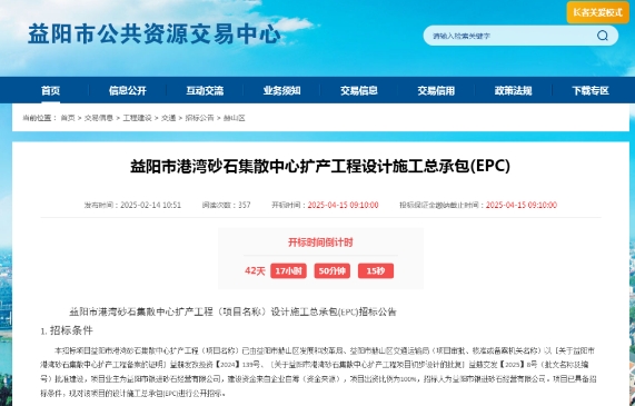 益陽市港灣砂石集散中心擴產(chǎn)工程 項目概況 本項目為益陽市港灣砂石集散中心擴產(chǎn)工程,位于湖南省益陽市。 建設(shè)規(guī)模:增設(shè)機制砂庫、緩沖倉(鋼筋混凝土筒倉5座)、增加部分破碎篩分洗砂等工藝設(shè)備、增加DCS 控制及監(jiān)控系統(tǒng)、增加臨時成品裝車系統(tǒng)。 招標(biāo)范圍:本項目的施工圖設(shè)計、施工、缺陷責(zé)任期修復(fù)及保修任務(wù),維護和維修質(zhì)保工作,滿足使用要求及后續(xù)服務(wù)等。 具體包括: (1)設(shè)計:根據(jù)批準(zhǔn)的初步設(shè)計所確定的所有設(shè)計內(nèi)容,完成本項目施工圖設(shè)計(含裝卸工藝及設(shè)備預(yù)埋件等),施工圖設(shè)計文件須達到國家關(guān)于水運工程設(shè)計深度的要求,并保證施工圖設(shè)計文件通過相關(guān)部門組織的審查; (2)施工:根據(jù)批準(zhǔn)的施工圖設(shè)計文件完成的所有工程施工,缺陷責(zé)任期修復(fù)以及保修任務(wù); (3)其他:協(xié)助業(yè)主完成本項目各類報批手續(xù),交(竣)工驗收,檔案、水保、環(huán)保等專項驗收、審計等。 2.4計劃工期:本項目總工期為150天,其中設(shè)計周期為30日歷天(從合同簽訂之日起開始計算),施工工期為120日歷天。 主要工期節(jié)點:(含設(shè)計周期,自開始工作日期始至交(竣)工日期止,包括施工圖設(shè)計、報審和施工); 開始工作日期:合同簽訂之日; 計劃設(shè)計工期:合同簽訂后30天提供設(shè)計成果; 計劃開工日期:暫定2025年6月1日(以監(jiān)理簽發(fā)開工令之日為準(zhǔn)); 計劃交工日期:2025年9月27日; 2.5招標(biāo)類別:設(shè)計施工總承包(EPC); 2.6標(biāo)段劃分:一個標(biāo)段。 投標(biāo)人資格要求 1、本次招標(biāo)要求投標(biāo)人須在人員、設(shè)備、資金等方面具有相應(yīng)的設(shè)計、施工能力,并具備以下資質(zhì)和業(yè)績: 資質(zhì)條件:施工:港口與航道工程施工總承包三級及以上資質(zhì);設(shè)計:工程設(shè)計水運行業(yè)甲級資質(zhì)或水運行業(yè)(港口工程專業(yè))甲級資質(zhì)或工程設(shè)計綜合甲級資質(zhì) 財務(wù)要求:應(yīng)附2023年經(jīng)會計師事務(wù)所或?qū)徲嫏C構(gòu)審計的財務(wù)會計報表(凈資產(chǎn)不能為負(fù);只需聯(lián)合體中牽頭人提供) 施工業(yè)績要求:近5年完成過一個合同金額不少于2346萬元的2000噸級及以上的碼頭工程施工 信譽要求: (1)投標(biāo)人未處于被責(zé)令停產(chǎn)、停業(yè)狀態(tài),未處于財務(wù)被接管、凍結(jié)、破產(chǎn)狀態(tài)。 (2)在“信用中國”網(wǎng)站中未被列入黑名單,且按照聯(lián)合懲戒要求,未被有關(guān)行政主管部門禁止投標(biāo)且處于處罰期內(nèi); 項目經(jīng)理的資格要求:為本項目項目負(fù)責(zé)人,具備港口與航道工程專業(yè)一級及以上注冊建造師資格,工程師高級及以上職稱,持有交通行政主管部門核發(fā)的B類安全生產(chǎn)考核合格證書。可兼任施工負(fù)責(zé)人。 設(shè)計負(fù)責(zé)人的資格要求:具有注冊土木工程師(港口與航道工程)執(zhí)業(yè)證書; 施工負(fù)責(zé)人的資格要求:具備港口與航道工程專業(yè)一級及以上注冊建造師資格,工程師高級及以上技術(shù)職稱,交通行政主管部門核發(fā)的B類安全生產(chǎn)考核合格證書 2、本次招標(biāo)接受(接受或不接受)聯(lián)合體投標(biāo)。聯(lián)合體投標(biāo)的,應(yīng)滿足下列要求: 聯(lián)合體牽頭人由聯(lián)合體成員中承擔(dān)施工任務(wù)的單位擔(dān)任,且聯(lián)合體中施工單位數(shù)量不超過1家,設(shè)計單位數(shù)量不超過1家。 投標(biāo)文件獲取及聯(lián)系方式 投標(biāo)文件遞交截止時間:2025年04月15日09:10 凡有意參加投標(biāo)者,請于2025年2月14日(北京時間,下同)起,登錄益陽市公共資源交易服務(wù)平臺(電子招標(biāo)投標(biāo)交易平臺名稱)下載電子招標(biāo)文件。 本次招標(biāo)公告同時在湖南省招標(biāo)投標(biāo)監(jiān)管網(wǎng)和益陽市公共資源交易中心網(wǎng)(發(fā)布公告的媒介名稱)上發(fā)布。 招 標(biāo) 人:益陽市銀進砂石經(jīng)營有限公司 地 址:益陽市赫山區(qū)梓山環(huán)路888號 聯(lián) 系 人:蔡先生 電 話:17711712228 招標(biāo)代理機構(gòu):湖南中源項目管理有限公司 地 址:長沙市天心區(qū)友誼路560號雅苑國際22樓 項目負(fù)責(zé)人:張鈺(項目負(fù)責(zé)人)、祝特、戴先桃 電 話:(0731)85861857