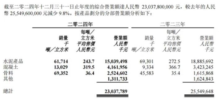 日前,華潤建材科技發(fā)布2024年年度業(yè)績報告。2024年,華潤建材科技取得營業(yè)額約230.38億元,同比減少9.8%;公司擁有人應(yīng)占盈利2.11億元,同比減少67.2。 在骨料銷售方面,2024年華潤建材科技對外銷量增加2376.9萬噸,銷售6935.2萬噸,較2023年增加52.14%。2024年骨料平均售價36.4元/噸,較2023年減少2.8%,綜合毛利率16.5%。 2024年,華潤建材科技水泥、混凝土及骨料生產(chǎn)線利用率分別為69.2%、33.9%及85.9%,而2023年則分別71.8%、25.9%及93.4%。 年報指出,截至2024年底,依托水泥礦山,華潤建材科技通過附屬公司擁有的在營(含試生產(chǎn))骨料年產(chǎn)能超1.08億噸,通過位于云南及福建的聯(lián)營公司股權(quán)權(quán)益擁有的應(yīng)占骨料年產(chǎn)能約370萬噸。全部建成后,華潤建材科技通過附屬公司掌握的骨料年產(chǎn)能預計將達近1.35億噸,通過聯(lián)營公司及合營公司股權(quán)權(quán)益掌控的應(yīng)占骨料年產(chǎn)能約1360萬噸。 毛利率35.1% 骨料平均售價36.4元/噸 據(jù)年報顯示,2024年華潤建材科技水泥產(chǎn)品、混凝土及骨料對外銷量減少760萬噸、增加370萬立方米及增加2380萬噸,較2023年分別減少10.9%、增加39.6%及增加52.1%。 2024年,華潤建材科技水泥產(chǎn)品、混凝土及骨料的平均售價分別為243.7元/噸、319.5元/方及36.4元/噸,較2023年分別減少10.6%、減少12.9%及增加2.8%。 年報顯示,2024年華潤建材科技水泥產(chǎn)品、混凝土及骨料的毛利率分別為15.1%、12.2%及35.1%,而2023年則分別為11.7%、11.9%及54.3%。 2024年,華潤建材科技綜合毛利38億元,較2023年的37.62億元增加1%,而綜合毛利率為16.5%,較2023年的14.7%增加1.8百分點。 2024年新增骨料產(chǎn)能1900萬噸 在骨料業(yè)務(wù)方面,2024年,華潤建材科技積極把握新業(yè)務(wù)發(fā)展機會,充分發(fā)揮水泥、骨料、混凝土的一體化協(xié)同優(yōu)勢,骨料業(yè)務(wù)取得快速發(fā)展,業(yè)務(wù)結(jié)構(gòu)優(yōu)化初見成效,新增骨料產(chǎn)能1900萬噸。 2月,位于廣東肇慶市的潤盛石場正式竣工投產(chǎn),新增骨料年產(chǎn)能約200萬噸。 3月,位于廣西貴港市平南縣的混凝土項目配套骨料生產(chǎn)線正式竣工投產(chǎn),新增骨料年產(chǎn)能約200萬噸。 7月,位于廣西貴港市覃塘區(qū)的東葉山骨料項目正式竣工投產(chǎn),新增骨料年產(chǎn)能約500萬噸。 10月,位于廣西賀州市富川縣的伍仔山骨料項目正式竣工投產(chǎn),新增骨料年產(chǎn)能約200萬噸;同月,位于云南大理白族自治州巍山縣的骨料項目試生產(chǎn)產(chǎn),新增骨料年產(chǎn)能約300萬噸。 12月,位于湖北咸寧市崇陽縣的潤陽骨料項目試生產(chǎn),新增骨料年產(chǎn)能約500萬噸。