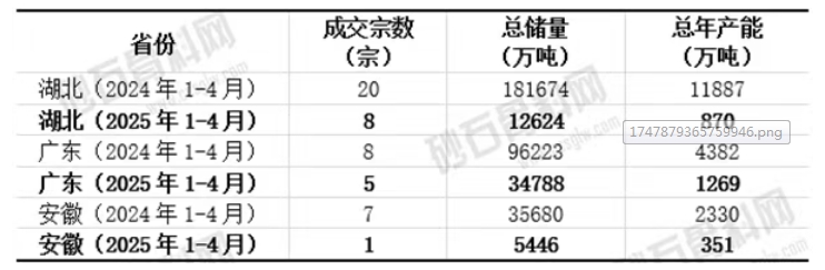 據(jù)統(tǒng)計(jì),在房地產(chǎn)市場持續(xù)低迷、基建工程開工率不足、市場需求尚未明顯回暖的背景下,2025年1-4月,全國砂石礦權(quán)成交277宗,同比減少24.11%,市場供應(yīng)呈現(xiàn)收縮態(tài)勢,砂石礦權(quán)交易遇冷。 其中,作為熱門出讓區(qū)域的湖北、廣東、安徽等省份砂石礦權(quán)交易交易規(guī)模銳減,國企參與度持續(xù)下滑。 1、湖北:交易規(guī)模斷崖式下跌,總量驟減超九成。2025年1-4月,湖北省砂石礦權(quán)交易數(shù)據(jù)全面下滑:成交宗數(shù)銳減60%,從2024年的20宗下降至8宗;總儲量暴跌93%,從18.17億噸下降至1.26億噸;總年產(chǎn)能驟降92.7%,從1.19億噸下降至870萬噸。 2、廣東:交易活躍度降溫,產(chǎn)能縮減超七成。廣東省砂石礦權(quán)交易呈現(xiàn)溫和收縮,成交宗數(shù)減少37.5%,從2024年的8宗下降至5宗;總儲量下降63.8%,從9.62億噸下降至3.48億噸;總年產(chǎn)能削減71%,從4382萬噸下降至1269萬噸。 3、安徽:礦權(quán)交易幾近停滯,降幅居三省之最。安徽省砂石礦權(quán)交易萎縮最為劇烈,成交宗數(shù)暴跌85.7%,僅成功出讓1宗;總儲量縮水84.7%,從3.57億噸下降至5446萬噸;總年產(chǎn)能下滑84.9%,從2330萬噸下降至351萬噸。 近兩年1-4月部分省份采礦權(quán)出讓情況對比表 4、國企、央企競礦比例延續(xù)下降趨勢。2024年1-4月,廣東、湖北及安徽三省共成功出讓采礦權(quán)35宗,其中18宗由國企或央企競得,占比51.4%;2025年1-4月,上述三省共成功出讓采礦權(quán)14宗,其中5宗由國企或央企競得,占比35.7%,國企與央企競得采礦權(quán)占比有所下降。
