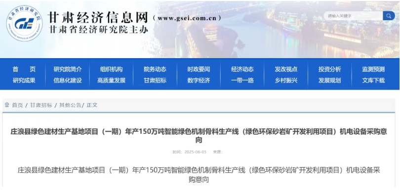 莊浪縣綠色建材生產(chǎn)基地項(xiàng)目(一期)年產(chǎn)150萬(wàn)噸智能綠色機(jī)制骨料生產(chǎn)線(綠色環(huán)保砂巖礦開(kāi)發(fā)利用項(xiàng)目)機(jī)電設(shè)備采購(gòu)意向