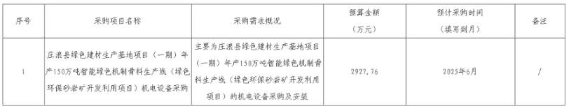 近日,甘肅平?jīng)霎a(chǎn)投綠能礦業(yè)開(kāi)發(fā)有限責(zé)任公司發(fā)布莊浪縣綠色建材生產(chǎn)基地項(xiàng)目(一期)年產(chǎn)150萬(wàn)噸智能綠色機(jī)制骨料生產(chǎn)線機(jī)電設(shè)備采購(gòu)意向。采購(gòu)預(yù)算金額為2927.76萬(wàn),預(yù)計(jì)采購(gòu)時(shí)間為2025年6月。