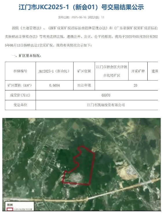 近日,廣東省江門市新會區(qū)大澤鎮(zhèn)田金村吉坑尾礦區(qū)建筑用花崗巖礦礦業(yè)權以68970萬元的價格成功出讓,競得人江門市凱瑞投資有限公司為當地民企。除成交價外,競拍人還需支付超15500萬元的其他費用。 該項目位于江門市新會區(qū)大澤鎮(zhèn)吉坑尾礦區(qū),項目建筑用花崗巖資源儲量4254.6萬立方米,項目生產規(guī)模240萬立方米/年(約720萬噸/年),出讓年限為20年。 該項目礦產資源儲量:建筑用花崗巖資源儲量4254.6萬立方米;剝離層1487.1萬立方米(其中砌筑或回填用半風化層543.0萬立方米;洗砂用全風化層和填土452.7 萬立方米;復墾用及景觀客土用殘坡積層和填土:491.4 萬立方米)。 項目生產規(guī)模240萬立方米/年。出讓年限20年,自頒發(fā)采礦許可證之日起算。 除成交價外,競拍人還需支付超15500萬元的其他費用: 采礦權競得人需向礦區(qū)范圍土地權屬單位每年繳納3200元/畝的土地租金,每三年遞增18%,由采礦權競得人與土地權屬簽訂租賃合同,合同期至礦山完成恢復治理閉坑結束。 競得者在競得采礦權后,在采礦許可證有效期內每年支付大澤鎮(zhèn)人民政府鄉(xiāng)村振興建設資金人民幣255萬元、維穩(wěn)幫扶資金人民幣100萬元、道路養(yǎng)護資金人民幣100萬元。(根據20年出讓年限,共計約9000萬元) 采礦權礦區(qū)及周邊測量、采礦權資產評估、采礦點項目社會穩(wěn)定風險評估和采礦權可行性研究報告等前期費用合計 41.7萬元。 采礦權競得人須在領取《采礦許可證》之日起6個月內建場(建設生產線、配備開采設備等)。但因不可抗力或政府的行為造成開工延誤的除外。礦山投產后12個月內必須通過綠色礦山認證。