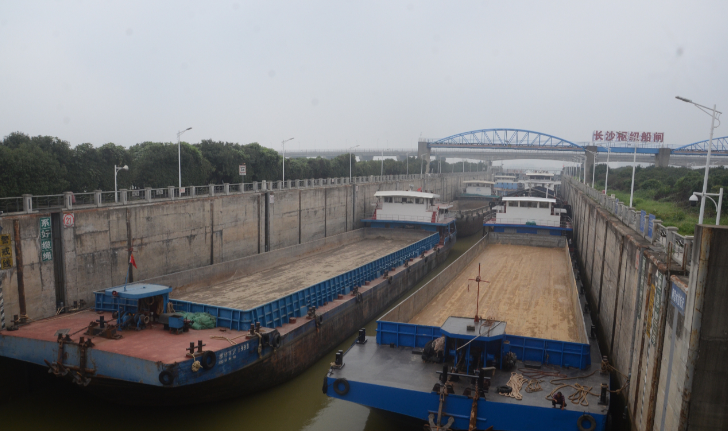 圖為沅水籍?dāng)?shù)艘返程砂石運(yùn)輸空船,通過湘江長沙樞紐船閘下駛。