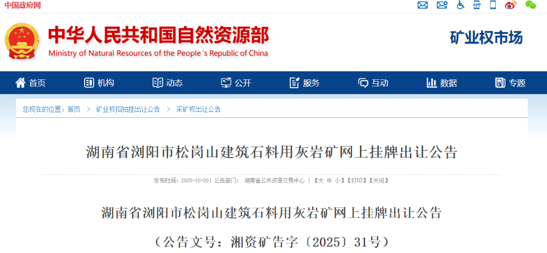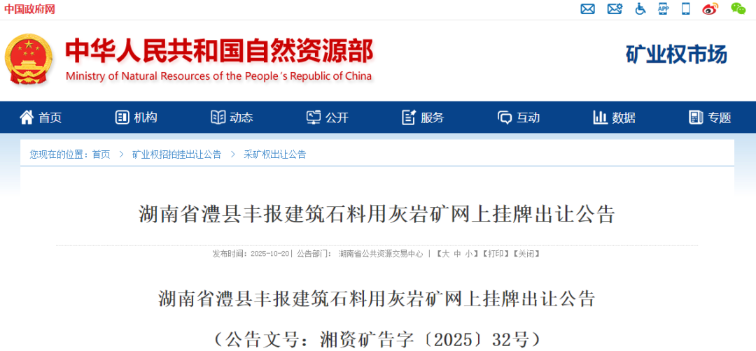 近日,湖南省自然資源廳發(fā)布兩則公告,同步啟動兩宗建筑石料用灰?guī)r礦的網(wǎng)上掛牌出讓工作。此次出讓的礦權分別位于瀏陽市和澧縣,涉及資源儲量超8700萬噸,總起始價達2.85億元,擬出讓年限最長15.5年,將為區(qū)域基礎設施建設、建筑產(chǎn)業(yè)發(fā)展提供重要資源支撐,也為礦業(yè)企業(yè)參與湖南礦產(chǎn)資源開發(fā)提供關鍵機遇。以下是兩宗礦權的詳細情況: