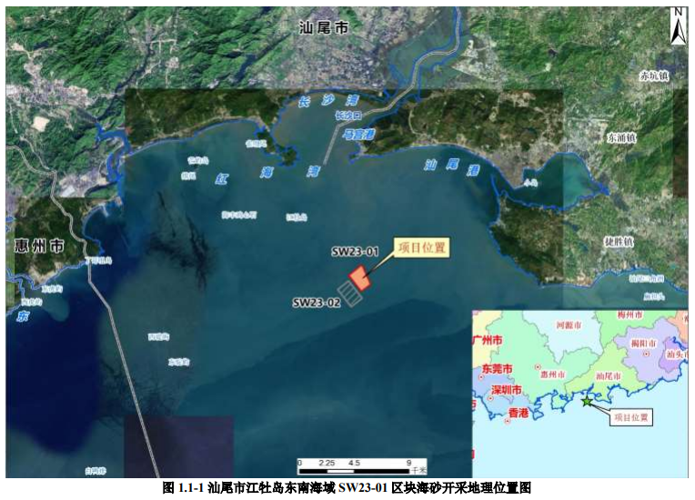 擬開采海砂 SW23-01 礦區(qū)位于廣東省汕尾市江牡島東南側(cè)海域東南約 5.9km 處, 行政區(qū)域隸屬?gòu)V東省汕尾市管轄,根據(jù)《廣東省汕尾市江牡島東南海域SW23-01礦區(qū)回填用海砂資源儲(chǔ)量核實(shí)報(bào)告》(汕尾市自然資源局,2025 年7月),礦區(qū)海砂原礦資源量共1301.89萬(wàn)方其中原礦控制資源量819.27萬(wàn)方,原礦推斷資源量482.62萬(wàn)方。