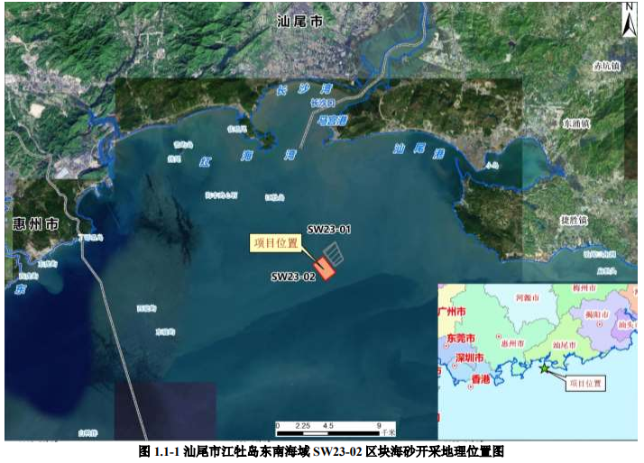 擬開采海砂 SW23-02 礦區(qū)位于廣東省汕尾市江牡島東南側(cè)海域東南約6.2km 處,行政區(qū)域隸屬?gòu)V東省汕尾市管轄根據(jù)《廣東省汕尾市江牡島東南海域SW23-02 礦區(qū)回填用海砂資源儲(chǔ)量核實(shí)報(bào)告》(汕尾市自然資源局,2025年7月),礦區(qū)海砂原礦資源量共2089.88萬(wàn)方,其中原礦控制資源量1468.5萬(wàn)方,原礦推斷資源量 621.29萬(wàn)方。