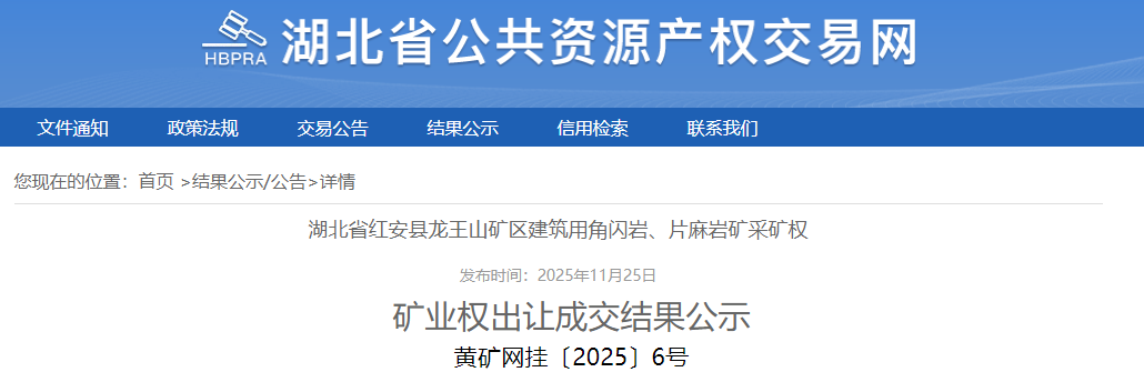 近日,湖北省公共資源產(chǎn)權(quán)交易網(wǎng)發(fā)布紅安縣龍王山礦區(qū)建筑用角閃巖、片麻巖礦采礦權(quán)出讓成交結(jié)果公示。紅安清源生態(tài)環(huán)保工程有限公司以19444.97萬元競(jìng)得該礦權(quán)。