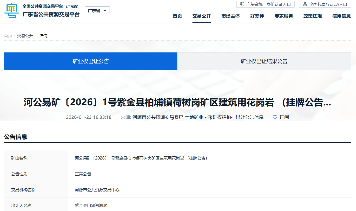 近日,廣東省公共資源交易平臺(tái)發(fā)布,紫金縣柏埔鎮(zhèn)荷樹崗礦區(qū)建筑用花崗巖礦采礦權(quán)掛牌出讓公告。