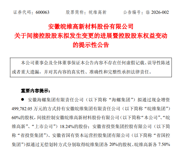 日前,A股上市公司皖維高新發(fā)布公告稱,手握1.67億噸骨料產(chǎn)能的行業(yè)巨頭海螺集團,擬通過現(xiàn)金增資49.98億元的方式持有皖維集團60%的股權,間接控制皖維高新18.24%的股份。安徽省投資集團、安徽省國控集團擬通過無償劃轉方式分別取得皖維集團各20%的股權、皖維高新各7.5%的股份,上述兩家企業(yè)與海螺集團構成一致行動人,海螺集團合計擁有皖維高新33.24%的表決權股份。