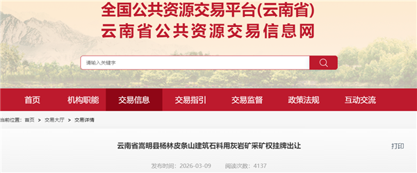 3月9日,云南省公共資源交易信息網(wǎng)發(fā)布昆明市嵩明縣楊林皮條山建筑石料用灰?guī)r礦掛牌出讓公告,掛牌時(shí)間為2026年4月7日至2026年4月21日。該礦總儲(chǔ)量超2.17億噸,開采規(guī)模500萬噸/年,服務(wù)年限36年,起始價(jià)超2.32億元,前期費(fèi)用186.2萬元,資源價(jià)款約1.07元/噸。