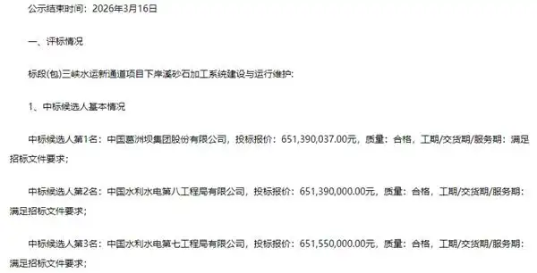 3月13日,三峽水運(yùn)新通道項(xiàng)目下岸溪砂石加工系統(tǒng)建設(shè)與運(yùn)行維護(hù)項(xiàng)目正式公示中標(biāo)候選人,公示期至3月16日結(jié)束。本次中標(biāo)候選人均為行業(yè)頭部央企,其中第一中標(biāo)候選人為中國葛洲壩集團(tuán)股份有限公司,第二中標(biāo)候選人為中國水利水電第八工程局有限公司,第三中標(biāo)候選人為中國水利水電第七工程局有限公司,三家企業(yè)投標(biāo)報(bào)價(jià)均突破6.51億元。