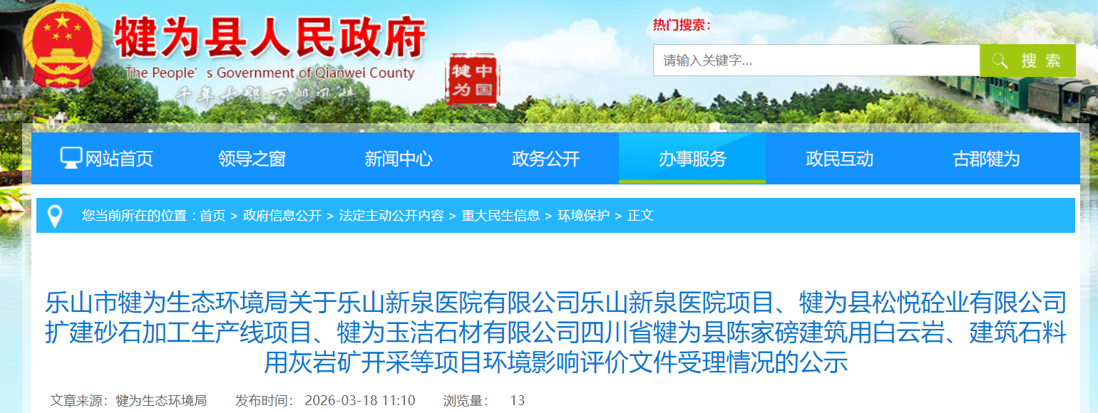 近日,四川省犍為縣人民政府受理犍為玉潔石材有限公司四川省犍為縣陳家磅建筑用白云巖、建筑石料用灰?guī)r礦開采項目環(huán)境影響評價文件。