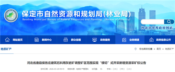 3月20日,河北省保定市自然資源和規(guī)劃局發(fā)布唐縣侯各莊建筑石料用灰?guī)r礦調(diào)整礦區(qū)范圍實(shí)現(xiàn)“橫切”式開采新增資源采礦權(quán)出讓公告,拍賣時(shí)間為2026年4月21日。該礦資源儲(chǔ)量4726.51萬噸,暫定出讓年限為8.8年,起始價(jià)4590.16萬元,折合資源價(jià)款約0.97元/噸。若加上超1億元的原采礦權(quán)資產(chǎn),該礦資源價(jià)款至少3元/噸。