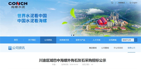 日前,川渝區(qū)域巴中海螺水泥有限責任公司發(fā)布外購石灰石采購招標公示,面向符合資質(zhì)的供應商公開招標石灰石供應,以滿足公司生產(chǎn)經(jīng)營用料需求。