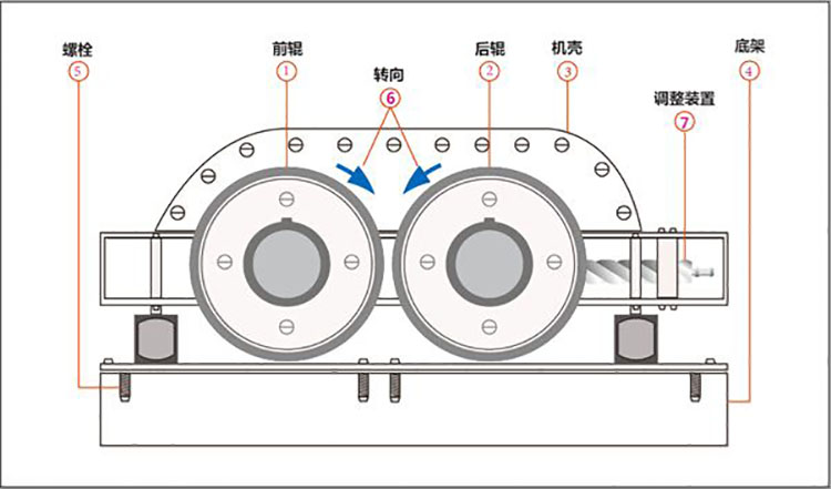 雙齒輥破碎機由傳動裝置,機架部分,破碎輥,機械彈簧裝置,聯(lián)動機構(gòu)等組成。