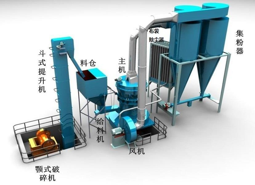 整條立磨生產系統由顎式破碎機、斗式提升機、糧倉、主機、給料機、分級機、鼓風機、管道裝置、儲料斗、電控系統、收集系統等組成。