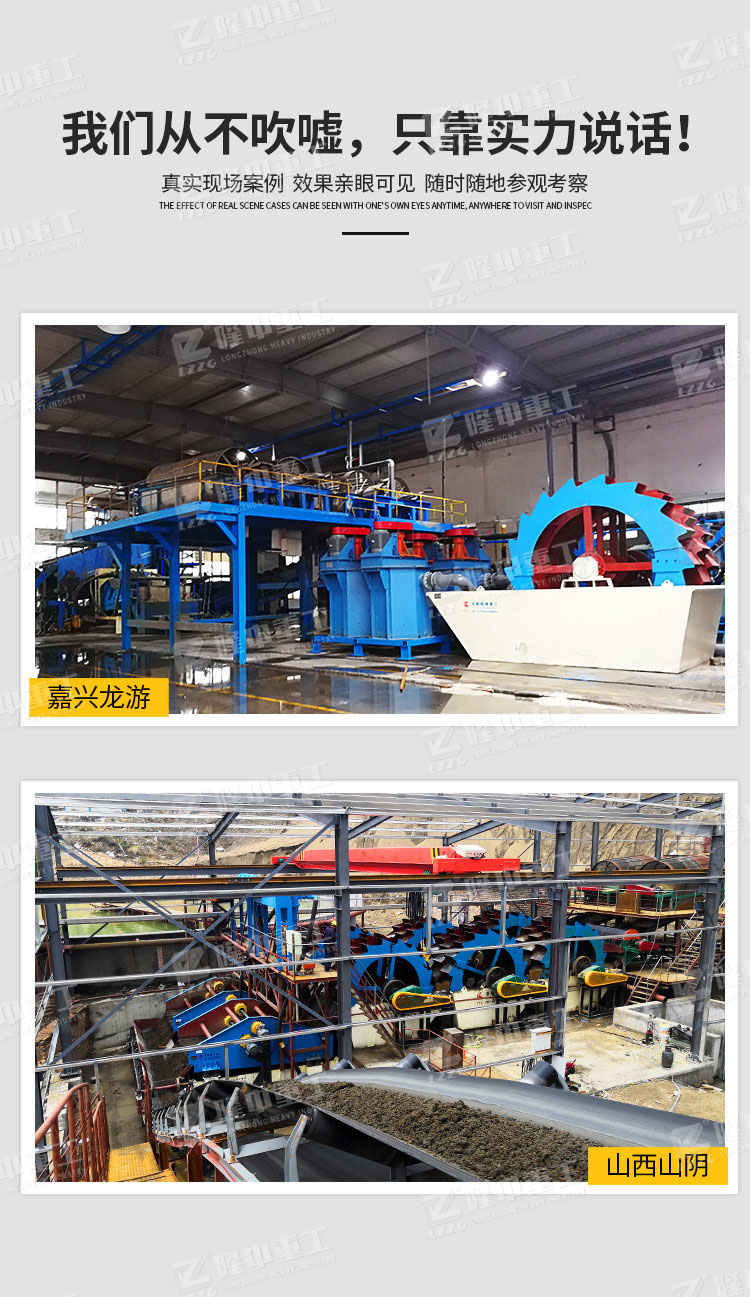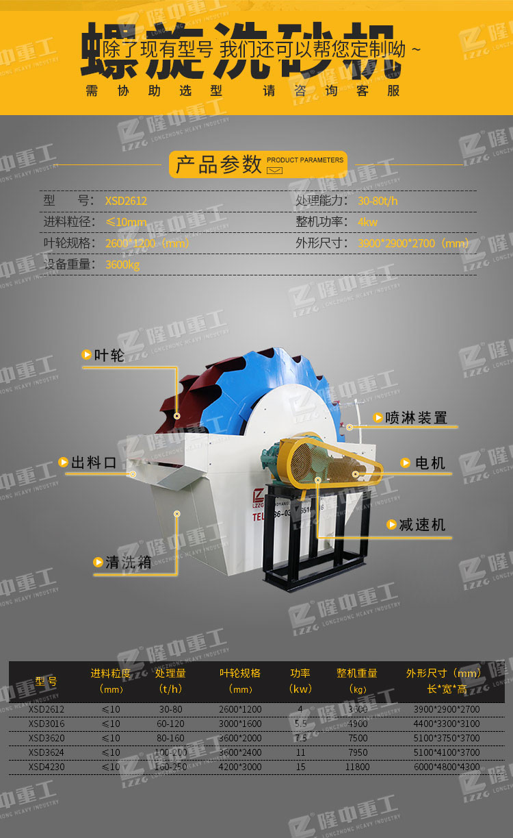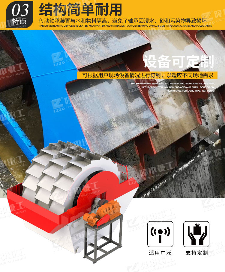 工作時,電機(jī)通過三角帶、減速機(jī)、齒輪減速后帶動葉輪緩慢轉(zhuǎn)動,砂石有給料槽進(jìn)入洗槽中,在葉輪的帶動下翻滾,并互相研磨,除去覆蓋砂石表面的雜質(zhì),同時破壞包覆砂粒的水汽層,以利于脫水;同時加水,形成強(qiáng)大水流,及時將雜質(zhì)及比重小的異物帶走,并從溢出口洗槽排出,完成清洗作用。干凈的砂石由葉片帶走,.后砂石從旋轉(zhuǎn)的葉輪倒入出料槽,完成砂石的清洗作用。