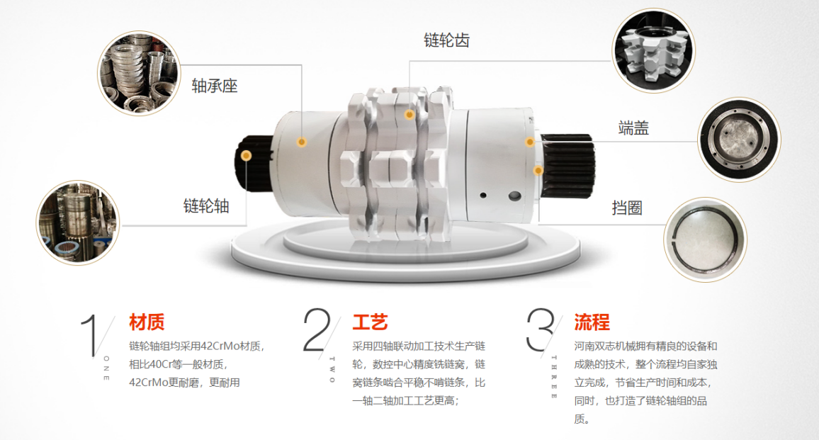 鏈輪軸組均采用42CrMo材質(zhì),相比40Cr等一般材質(zhì),42CrMo更耐磨,更耐用。