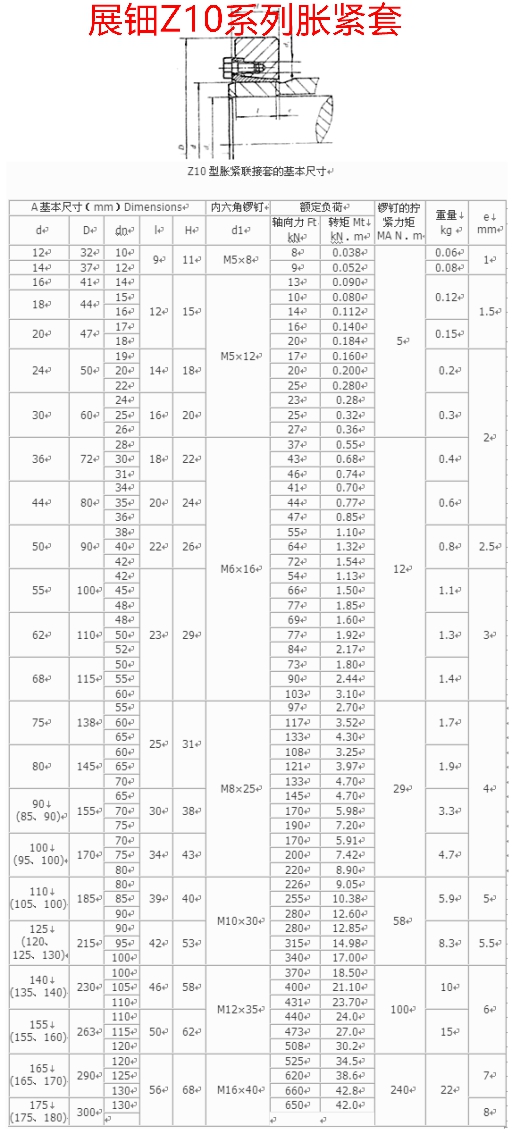 Z10型系列脹緊套型號如下:Z10-12×32、Z10-14×37、Z10-16×41、Z10-18×44、Z10-20×47、Z10-24×50、Z10-30×60、Z10-36×72、Z10-44×80、Z10-50×90、Z10-55×100、Z10-62×110、Z10-68×115、Z10-75×138、Z10-80×145、Z10-90×155、Z10-85×155、Z10-100×170、Z10-95×170、Z10-110×185、Z10-105×185、Z10-125×215、Z10-120×215、Z10-130×215、Z10-140×230、Z10-135×230、Z10-155×263、Z10-160×263、Z10-165×290、Z10-170×290、Z10-175×300、Z10-180×300、Z10-185×330、Z10-190×330、Z10-200×350、Z10-195×350、Z10-220×370、Z10-210×370、Z10-240×405、Z10-230×405、Z10-260×430、Z10-250×430、Z10-280×460、Z10-270×460、Z10-300×485、Z10-290×485、Z10-320×520、Z10-310×520、Z10-340×570、Z10-330×570、Z10-360×590、Z10-350×590、Z10-390×650、Z10-380×650、Z10-420×670、Z10-400×670、Z10-440×740、Z10-430×740、Z10-460×770、Z10-450×770、Z10-480×800、Z10-470×800、Z10-500×850、Z10-490×850、Z10-530×910、Z10-520×910、Z10-560×940、Z10-550×940、Z10-590×980、Z10-580×980、Z10-620×1020、Z10-610×1020。