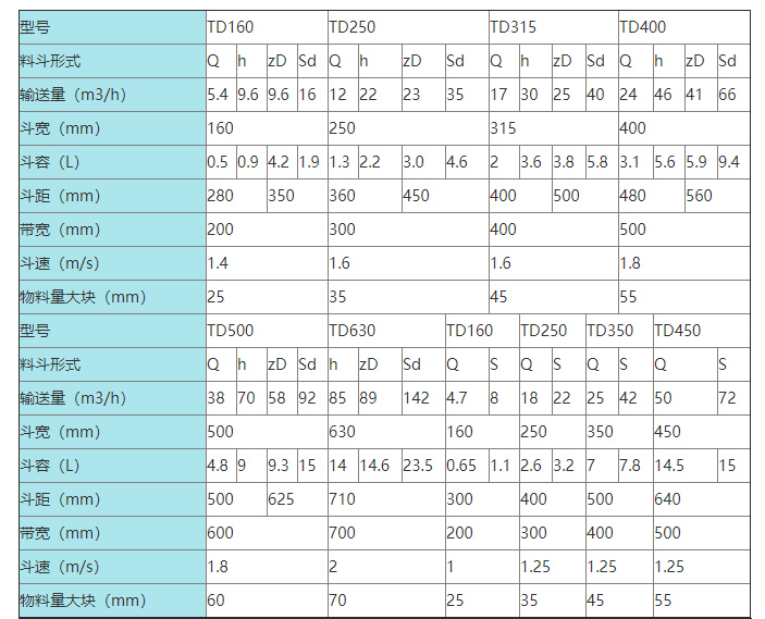 TD膠帶斗式提升機(jī)是適用于垂直輸送粉狀、粒狀、及小塊狀的磨吸性較小的散狀物料,如糧食、煤、水泥、碎礦石等,提升高度40m。其規(guī)格有TD100(不常用)、TD160、TD250、TD315、TD400、TD500、TD630、TD800、TD1000等型號,其中TD160、TD250、TD315等型號為普遍采用型號。本系列提升機(jī)代號為TD,即帶式斗式提升機(jī);產(chǎn)品規(guī)格以斗寬表示。TD帶式斗式提升機(jī)特點為:結(jié)構(gòu)簡單,運(yùn)行平穩(wěn),挖取式裝料,離心重力式卸料,物料溫度不超過60℃;TD型斗式提升機(jī)備有四種料斗,即:Q型(淺斗)、H型(弧底斗)、ZD型(中深斗)、SD型(深斗)。