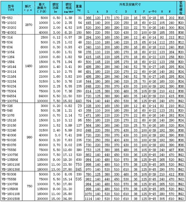 VB-60376-W振動(dòng)電機(jī)外形安裝尺寸技術(shù)參數(shù)表: