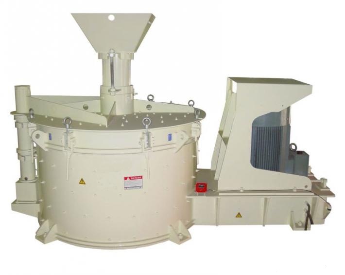 物料由進(jìn)料斗進(jìn)入制沙機(jī),經(jīng)分料器將物料分成兩部分,一部分由分料器中間進(jìn)入高速旋轉(zhuǎn)的葉輪中,在葉輪內(nèi)被迅速加速,其加速度可達(dá)數(shù)百倍重力加速度,然后以60-70米/秒的速度從葉輪三個(gè)均布的流道內(nèi)拋射出去,首先同由分料器四周落下的一部分物料沖擊破碎,然后一起沖擊到渦支腔內(nèi)物料襯層上,被物料襯層反彈,斜向上沖擊到渦動(dòng)腔的頂部,又改變其運(yùn)動(dòng)方向,偏轉(zhuǎn)向下運(yùn)動(dòng),從葉輪流道發(fā)射出來的物料形成連續(xù)的物料幕。