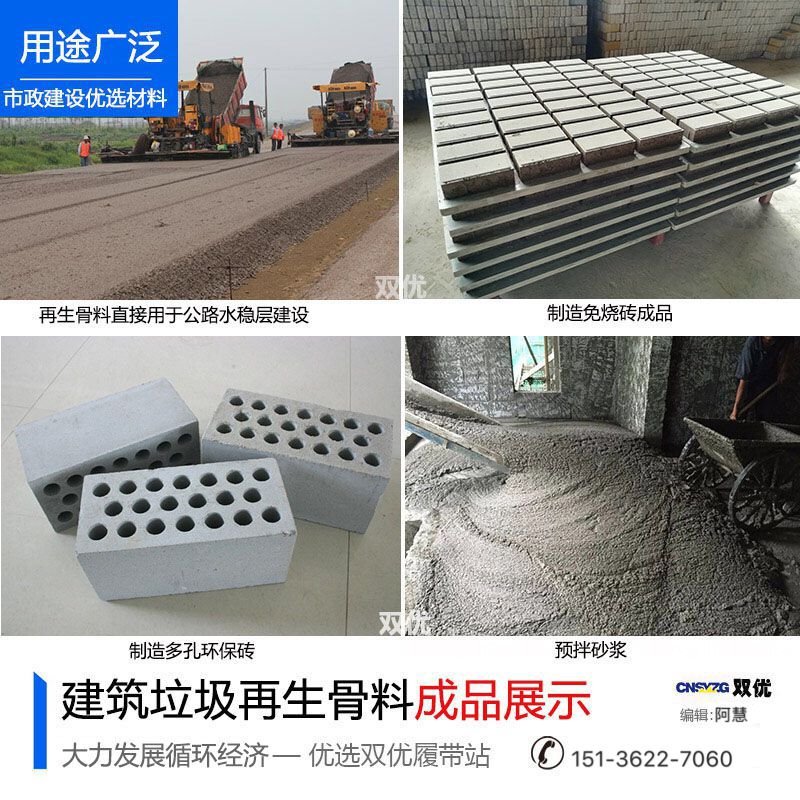 鄭州雙優(yōu)重工所研發(fā)生產(chǎn)的新型移動破碎站,是一款建筑垃圾處理設備,主要用于建筑垃圾資源化處置,能夠?qū)ㄖ行缘钠扑楹Y分,生產(chǎn)出符合標準的新的砂石骨料,這些建筑垃圾骨料可以替代天然砂石重新運用在建筑行業(yè)。這款新型移動破碎站能生產(chǎn)出4種不同規(guī)格再生骨料,可以用于生產(chǎn)路基材料、環(huán)保水泥磚、混凝土等,實現(xiàn)建筑垃圾循環(huán)再利用。