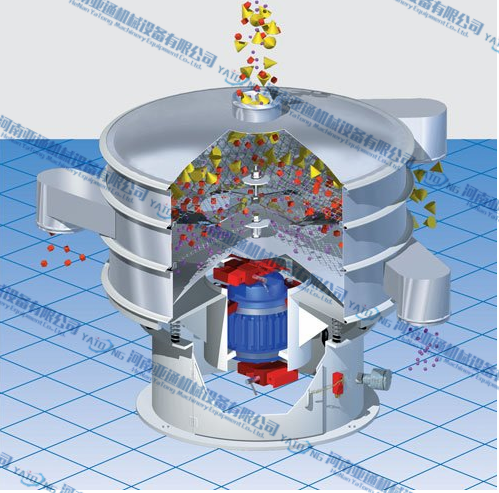 旋振篩是由底座的普通電機(jī),通過(guò)橡膠聯(lián)軸器,帶動(dòng)激振器、激振器的上下兩端裝有偏心重錘,將電機(jī)的旋轉(zhuǎn)運(yùn)動(dòng)變?yōu)榇怪薄⑺健A斜的三次元運(yùn)動(dòng),再把運(yùn)動(dòng)傳遞給篩面,調(diào)節(jié)上下兩端偏心重錘的相位角來(lái)改變物料在篩面上的運(yùn)動(dòng)軌跡。