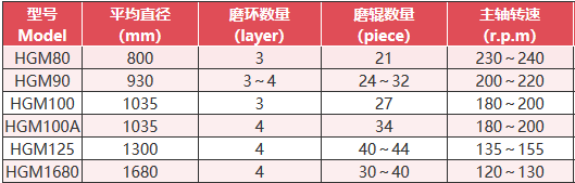 工作時,主機電動機通過減速器帶動主軸及轉盤旋轉,轉盤邊緣的輥銷帶動幾十個磨輥在磨環(huán)滾道內滾動。