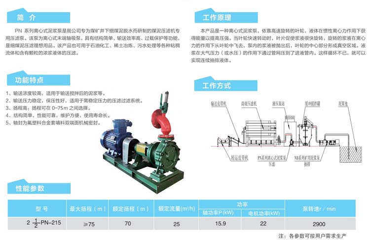 PN系列離心式泥漿泵是我公司專為煤礦井下細煤泥脫水而研制的煤泥壓濾機壓濾泵。該泵為離心式末端軸吸泵,具有結(jié)構(gòu)簡單、過載保護等功能,是細煤泥壓濾理想用品。該產(chǎn)品也可用于石油化工、稀土冶煉、污水處理等各種粘稠流體和含有顆粒的濃漿液體的壓濾。