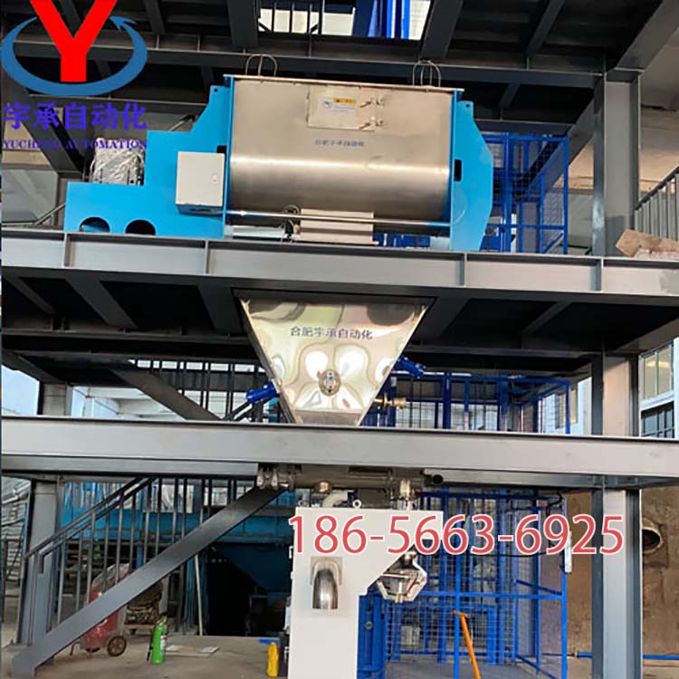 原料經(jīng)升降機(jī)送至投料平臺--人工將稱好的物料直接通過投料口投入混合機(jī)——混合機(jī)按照設(shè)置時間自動進(jìn)行物料混合工作--混合均勻的物料卸進(jìn)過渡料倉---人工套袋自動稱重---人工輔助熱封口。