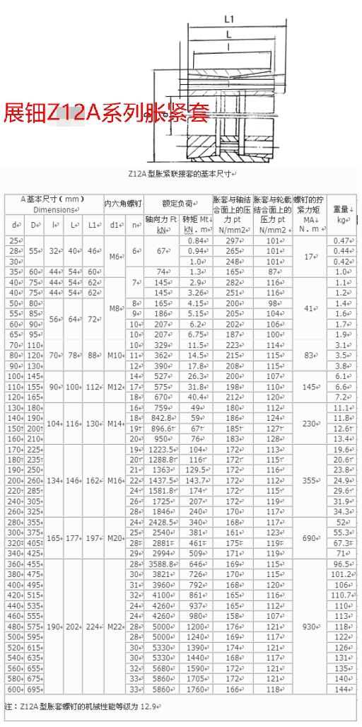 Z12a型系列脹緊套型號如下:Z12a-25×55 、Z12a-28×55 、Z12a-30×55、Z12a-35×60、Z12a-40×75、Z12a-45×75、Z12a-50×80、Z12a-55×85、Z12a-60×90、Z12a-65×95、Z12a-70×110、Z12a-80×120、Z12a-90×130、Z12a-100×145、Z12a-110×155、Z12a-120×165、Z12a-130×180、Z12a-140×190 、Z12a-150×200、Z12a-160×210、Z12a-170×225、Z12a-180×235 、Z12a-190×250 、Z12a-200×260 、Z12a-220×285 、Z12a-240×305 、Z12a-260×325 、Z12a-280×355 、Z12a-300×375 、Z12a-320×405 、Z12a-340×425 、Z12a-360×455 、Z12a-380×475 、Z12a-400×495 、Z12a-420×515 、Z12a-440×535 、Z12a-460×555 、Z12a-480×575 、Z12a-500×595 、Z12a-520×615 、Z12a-540×635 、Z12a-560×655 、Z12a-580×675 、Z12a-600×695。注:Z12A型脹緊聯(lián)結(jié)套螺釘?shù)臋C械性能等級為12.9級。