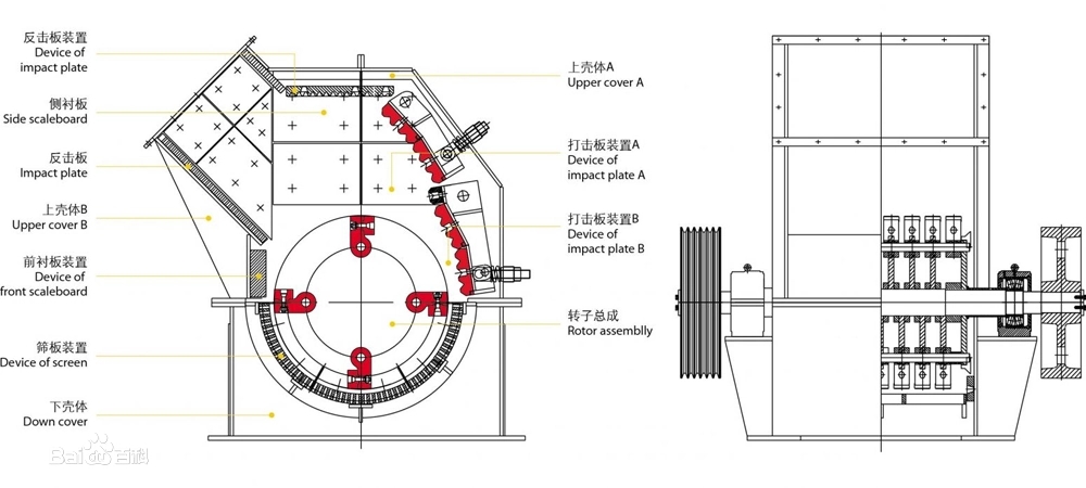 本設(shè)備主要有回轉(zhuǎn)部、護(hù)板部和箱體部組成,回轉(zhuǎn)部的輪芯上有多個(gè)非重疊排列的錘架,錘頭固定在錘架上,錘頭寬度大于錘架和輪轂,輪芯由數(shù)個(gè)輪轂組成一體,固定于主軸上,主軸兩端用滾動(dòng)軸承座支承于機(jī)架上,護(hù)板組成分成若干塊固定于箱體上,保護(hù)箱體不受磨損,并形成不同型式的反擊破碎腔。箱體分成上下兩部分,用螺拴連接,便于拆裝和檢修