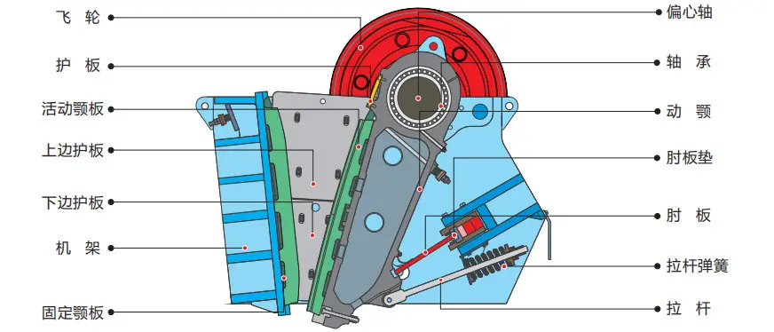 顎式破碎機(jī)的主要工作部件是兩個(gè)顎板,一個(gè)固定顎板和一個(gè)活動(dòng)顎板。當(dāng)活動(dòng)顎板對(duì)固定顎板做周期性的往復(fù)運(yùn)動(dòng)時(shí),夾在其中的礦石受到擠壓、劈裂和彎曲作用而破碎。這種破碎方式使得顎式破碎機(jī)能夠處理各種硬度的礦石和巖石。