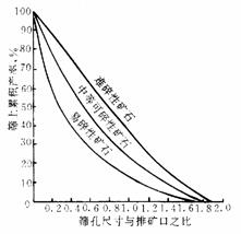 利用典型粒度特性曲線可很方便地確定破碎排礦口大小。例如圖8表示了顎式破碎機破碎三種不同硬度的礦石時典型粒度特性曲線。若某選礦廠破碎礦石為中硬礦石,生產(chǎn)中要求其產(chǎn)品最大粒度(d最大)為20.0mm,從圖2—5的曲線上查得相對最大粒度Z最大=1.6,