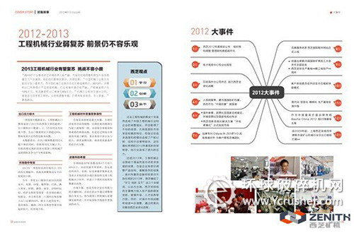 第二期《Made In ZENITH》依舊為中英雙刊,此次首先發(fā)行的是中文版。相較于首期“為客戶展現(xiàn)靈魂團(tuán)隊”的視角,此期《Made In ZENITH》更為關(guān)注全球工程機械行業(yè)在身處困境時,西芝和其他中國企業(yè)如何迎接挑戰(zhàn),把握機遇。刊物就2013年行業(yè)環(huán)境和發(fā)展趨勢、行業(yè)動態(tài)、2012年西芝年度事件、2013年西芝創(chuàng)新舉措和已取得的成績一一進(jìn)行了分析與詮釋。