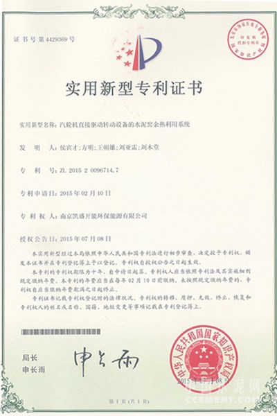 近日,南京凱盛開能環(huán)保能源有限公司科技成果“汽輪機直接驅(qū)動轉(zhuǎn)動設(shè)備的水泥窯余熱利用系統(tǒng)”實用新型專利喜獲中華人民共和國國家知識產(chǎn)權(quán)局授權(quán),該系統(tǒng)主要利用水泥窯余熱產(chǎn)生的過熱蒸汽直接驅(qū)動高溫風(fēng)機、窯尾排風(fēng)機以及水泥磨等轉(zhuǎn)動設(shè)備。這是公司獲得的第39項專利技術(shù)。