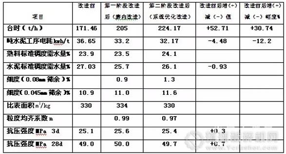 5、兩項(xiàng)改造綜合改造后與改造前相比的最好效果:磨機(jī)系統(tǒng)臺時產(chǎn)量提高了52.71t/h,提高了30.74%;噸水泥工序電耗降低了4.48kwh/t,降低了12.2%;水泥標(biāo)準(zhǔn)稠度需水量降低了0.93%。