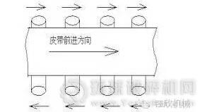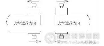 1. 調整承載托輥組 皮帶在整個皮帶輸送機的中部跑偏時可調整托輥組的位臵來調整跑偏;在制造時托輥組的兩側安裝孔都加工成長孔,以便進行調整。具體調整方法,具體方法是皮帶偏向哪一側,托輥組的哪一側朝皮帶前進方向前移,或另外一側后移。如圖所示皮帶向上方向跑偏則托輥組的下位處應當向左移動,托輥組的上位處向右移動。
