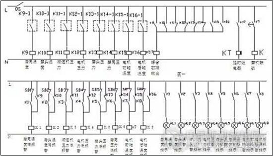 在圖中,K9-1至K16-1為現(xiàn)場(chǎng)的儀表溫度報(bào)警和點(diǎn)接點(diǎn)壓力表的上限輸出開(kāi)關(guān)量。K9、K10、K15、K16為儀表溫度檢測(cè)輸出繼電器,K11、K12、K13、K14為壓力輸出繼電器。在圖二中K1至K8為故障報(bào)警繼電器,HL1至HL8為報(bào)警指示燈,SB1至SB8為報(bào)警復(fù)位按鈕。